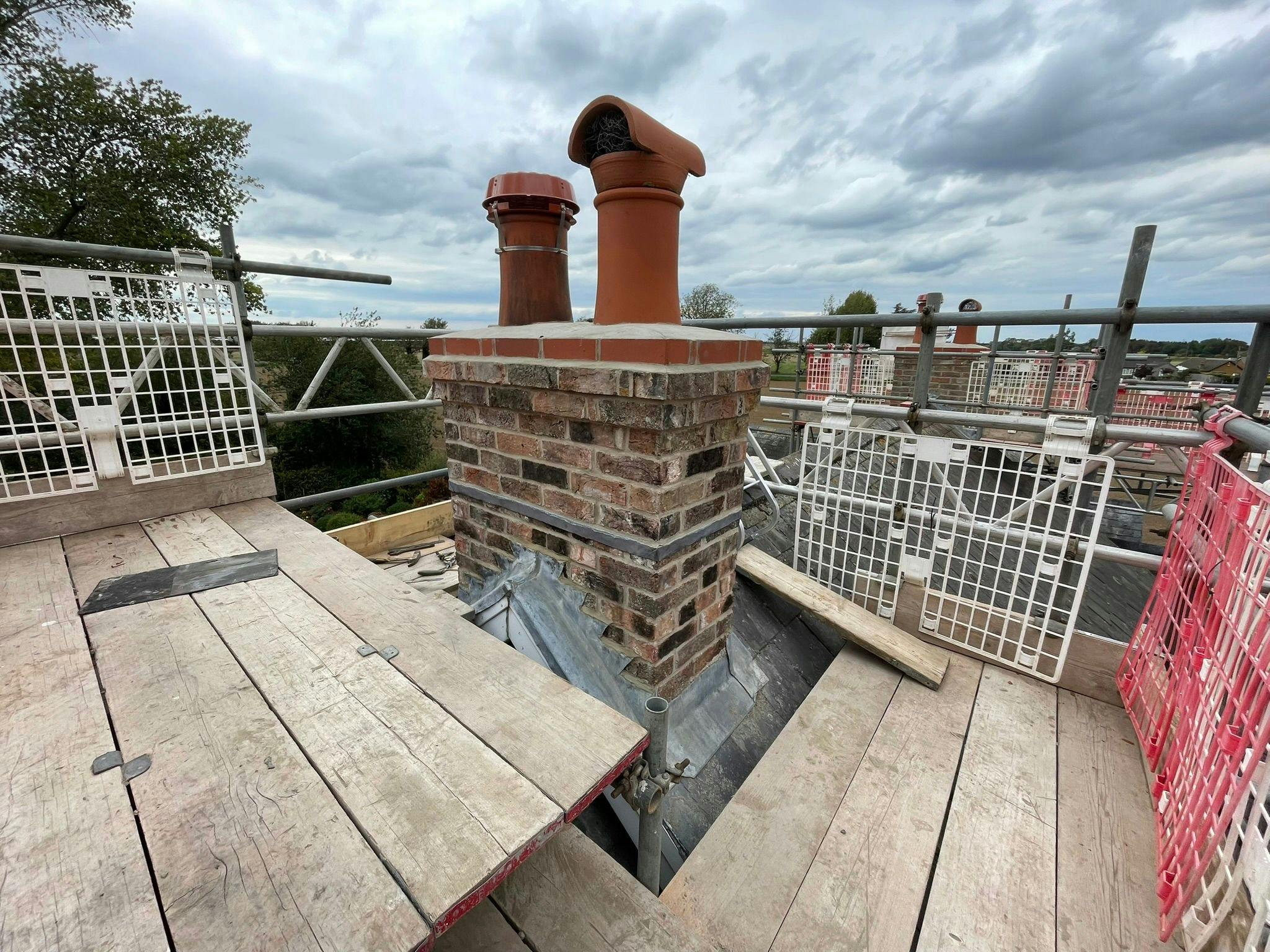 Weather damage can quickly compromise a chimney's structural integrity. We recently completed this restoration project to repair perished mortar and unstable brickwork caused by exposure to the elements.